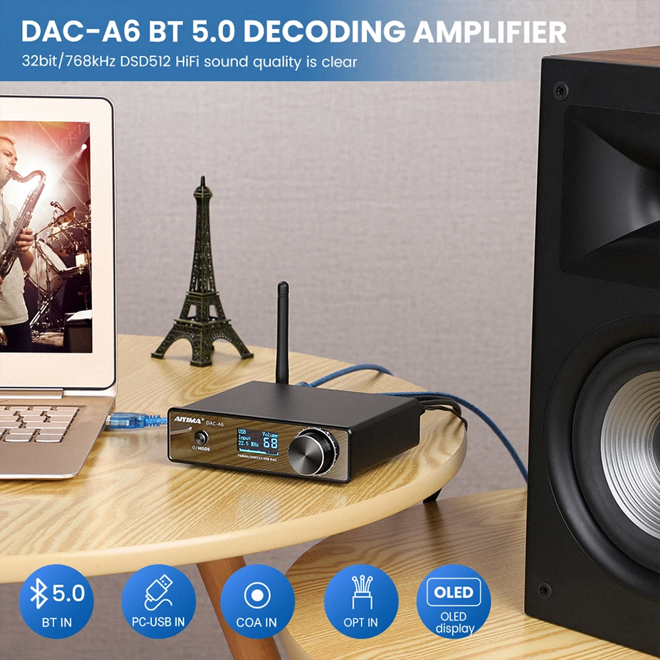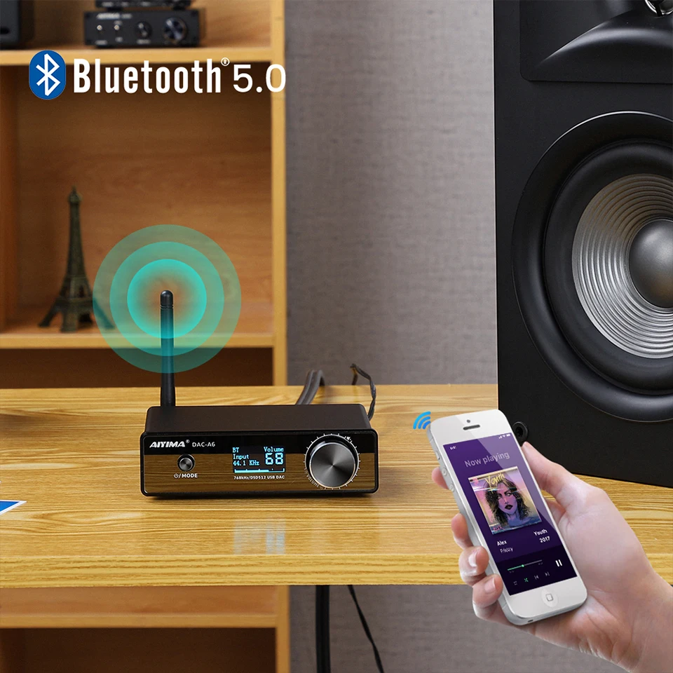 DAC A6 поддерживает Bluetooth/PC-USB/коаксиальный/OPT, он может совместим с большинством аудио оборудования на рынке.