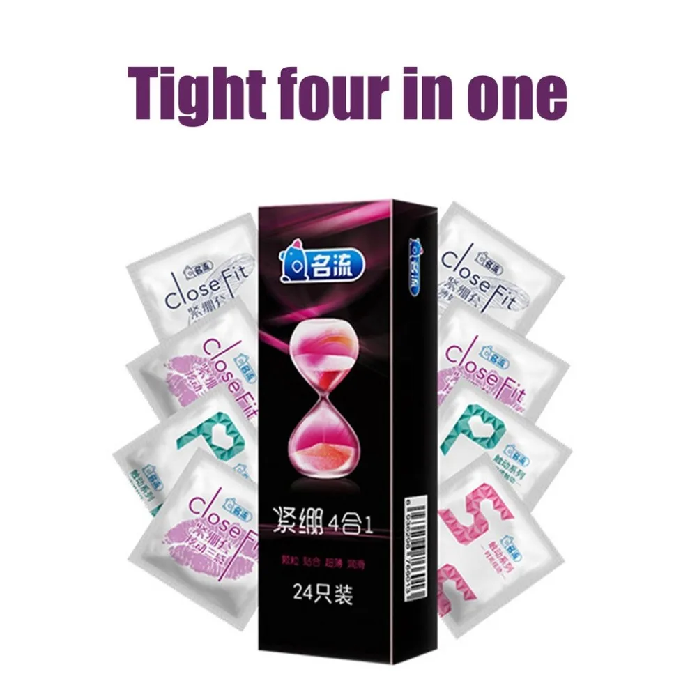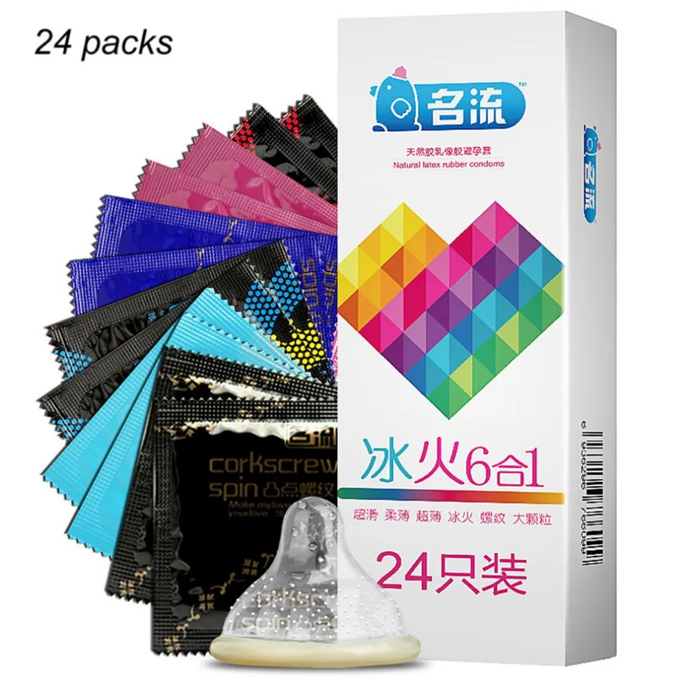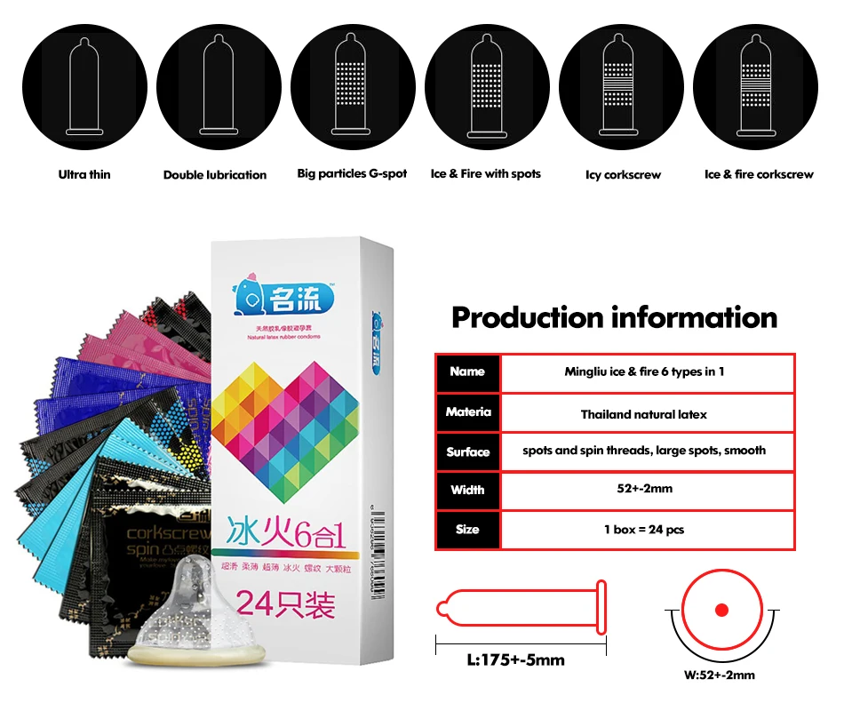 24 шт презервативы#1. Лед и огонь (ультра тонкий 002, двойная смазка, лед & огонь G-spot, большие частицы G-spot, лед & fire cokescrew, ледяной cokescrew), ширина 52 мм.