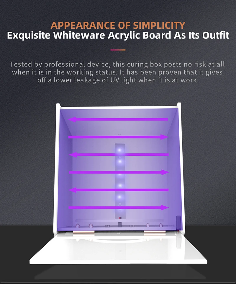 Протестировано профессиональным устройством, этот ящик для отверждения не создает никаких рисков, когда он находится в рабочем состоянии. Было доказано, что он дает более низкую утечку УФ-светильник, когда он находится на работе.