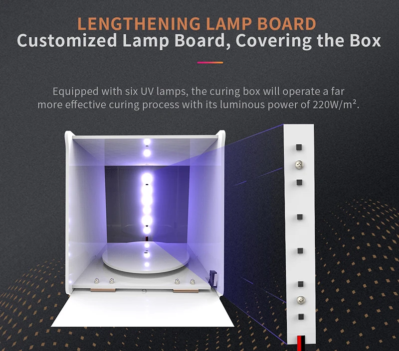 Оснащенный шестью УФ-лампами, отверждающая коробка будет работать гораздо более эффективным процессом отверждения с его световой мощностью 220 Вт/м2.