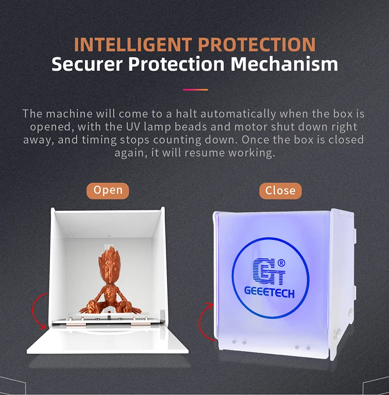 Машина автоматически остановится, когда коробка будет открыта, с УФ-лампами и электродвигателем немедленно отключится, и время прекратится отсчет. Как только коробка снова закроется, она возобновит работу.