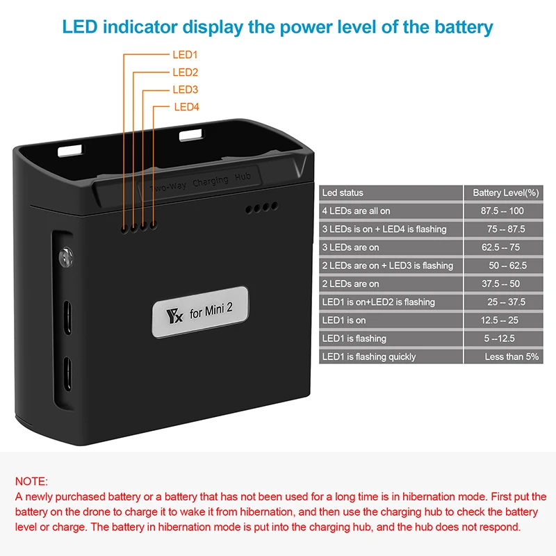 Новый аккумулятор или аккумулятор, который долгое время не используется, будут в спящем состоянии. Пожалуйста, положите спящую батарею на Дрон, чтобы зарядить и активировать батарею, а затем используйте этот менеджер зарядки, чтобы проверить питание и зарядку. Примечание: поместите аккумулятор в спящее состояние в зарядное устройство, зарядное устройство не ответит.