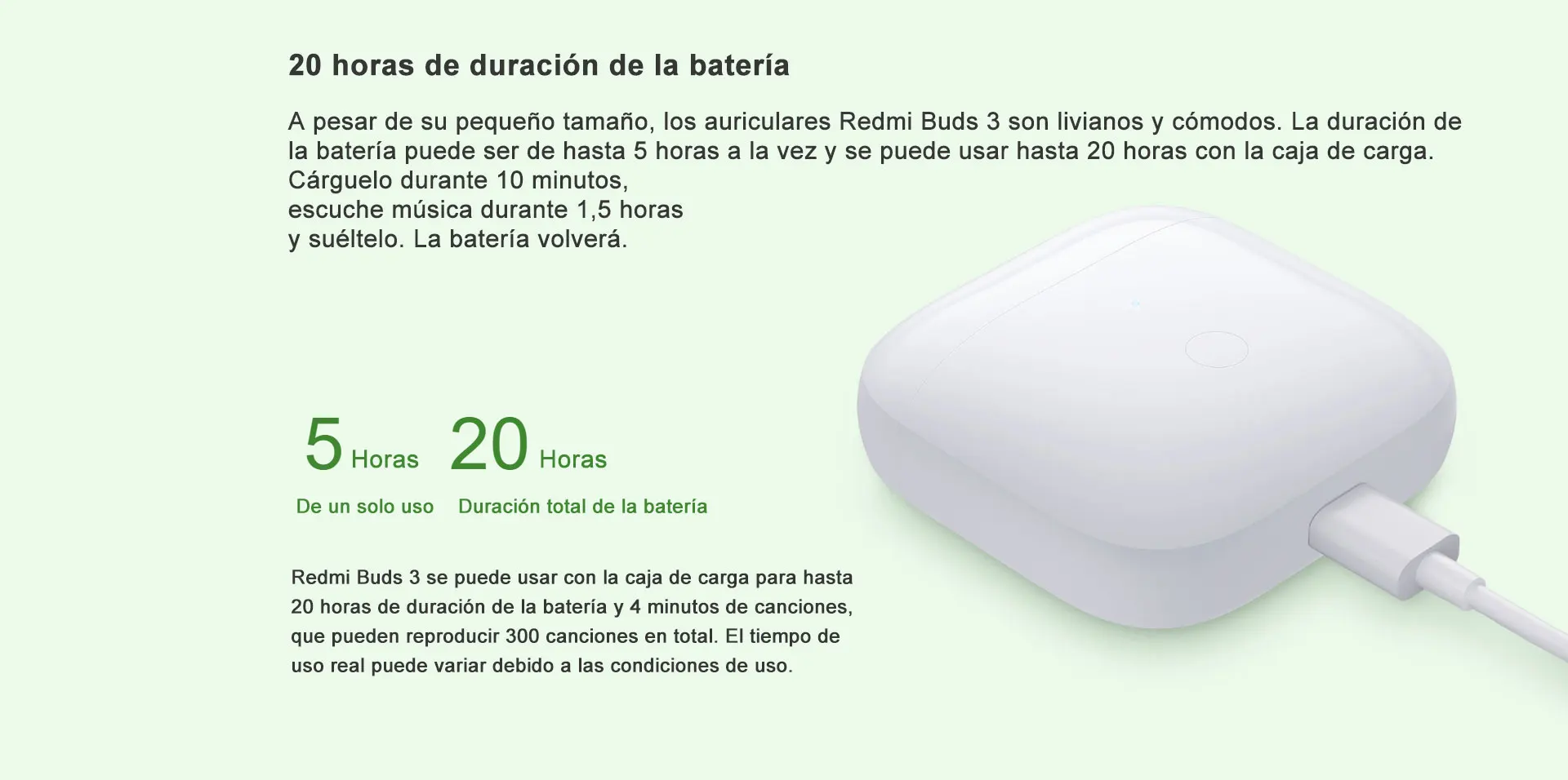 * Redmi Buds 3 можно использовать с зарядным устройством до 20 часов работы от батареи и 4 минуты песен, которые могут воспроизводить в общей сложности 300 песен. Фактическое время использования может отличаться из-за условий использования.
