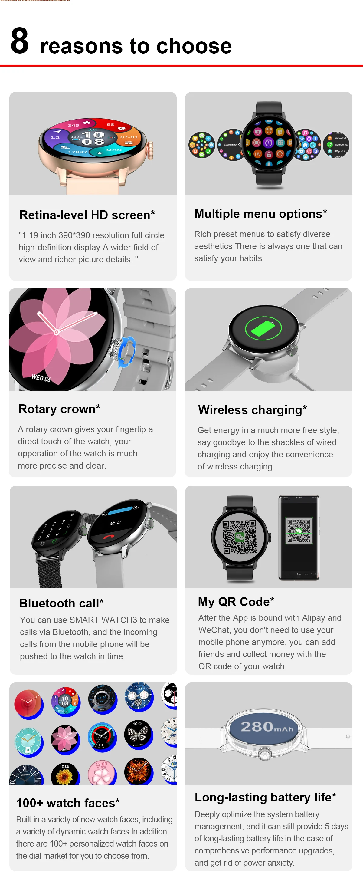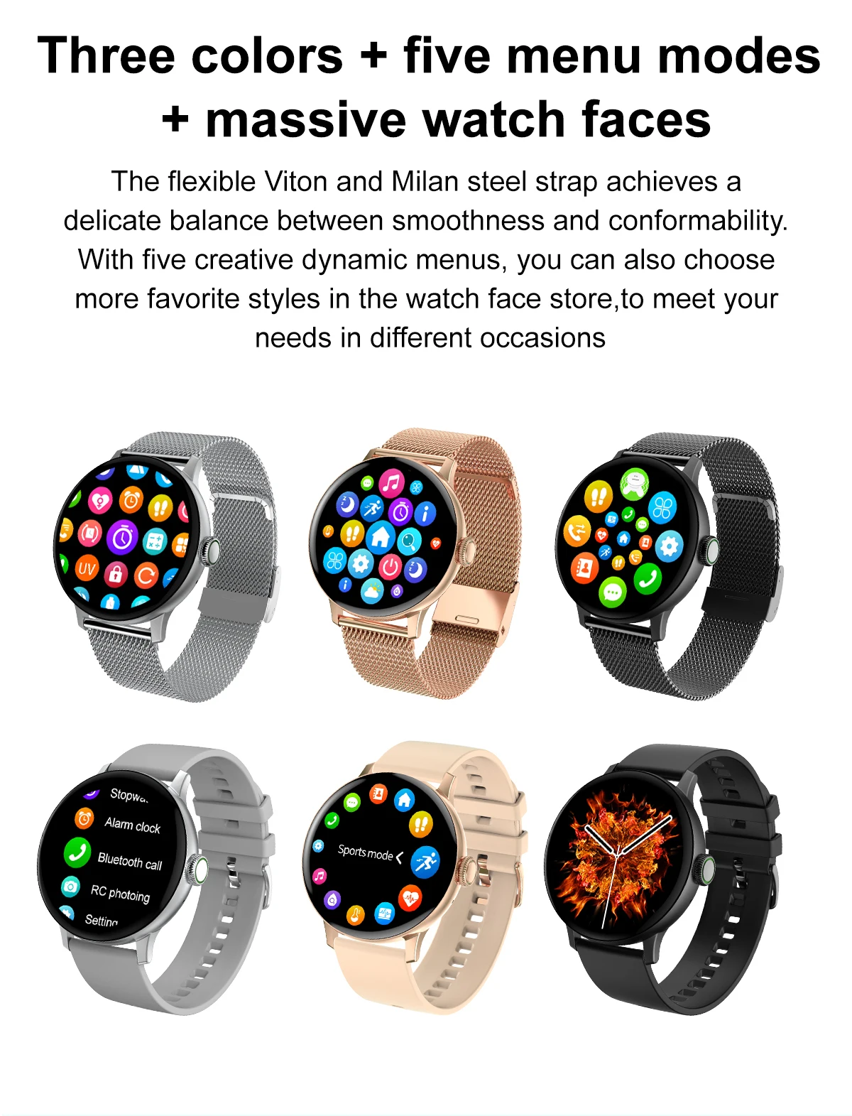 Функции: тренировка дыхания, нажатие на циферблате, секундомер, контроль яркости, мульти-спортивный режим, монитор сна, пульс, информация, удаленная музыка, удаленная фотография, погода, найти телефон (доступен после подключения телефона), bluetooth Вызов, воспроизведение музыки bluetooth, защита паролем, калькулятор, Раздельный дисплей, ярлык widgets, погода, Женский персонал, массажер
