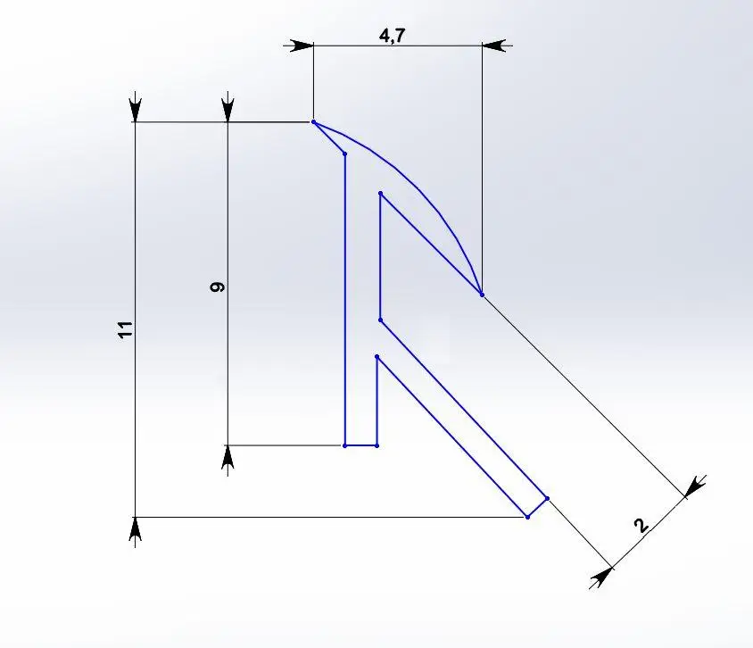 Ширина проема 2мм, толщина стенок 0,95мм, толщина профиля 4,7мм, ширина профиля 11мм.