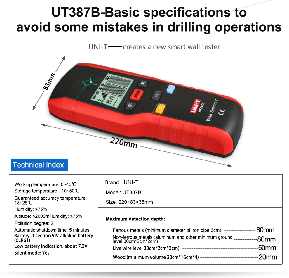 Сканеры стен Серии UT387-это отличные инструменты, предназначенные для строительства и домашнего улучшения. Эти сканеры могут собирать скрытые предметы за стенками, такие как металлы, электрические провода и дерево.