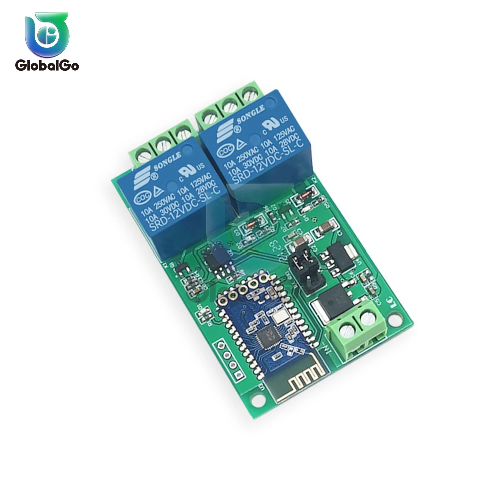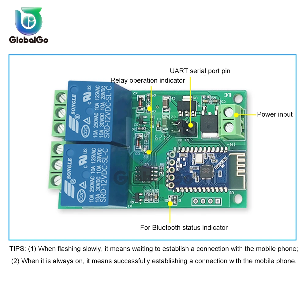 Двойной релейный модуль bluetooth 5 В/12 В включает 2 релейных модуля 5 В/10 А и 12 В/10 А и SPP-C подчиненный модуль последовательного порта Bluetooth, который может управлять переключателем реле, отправив инструкции через мобильный телефон APP.