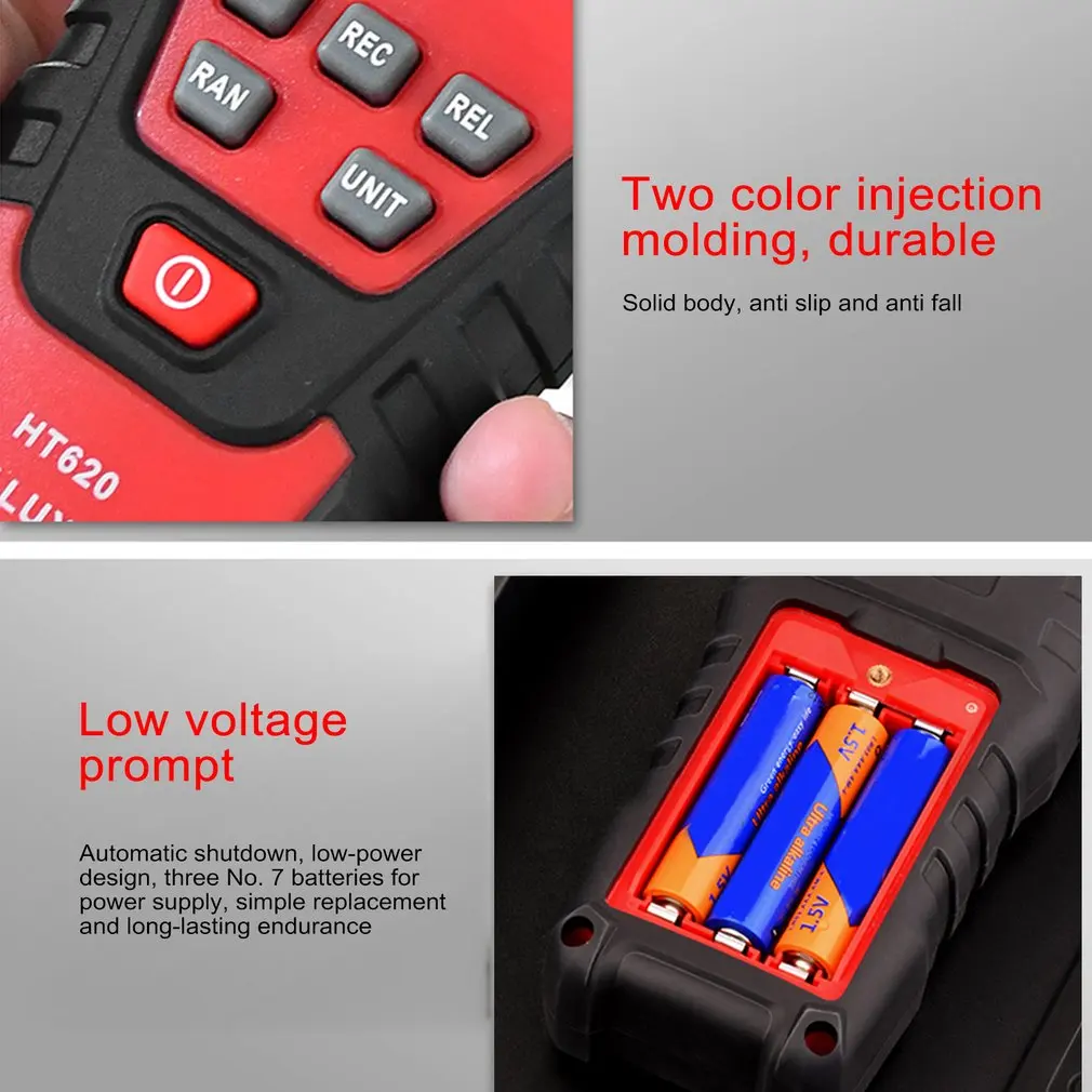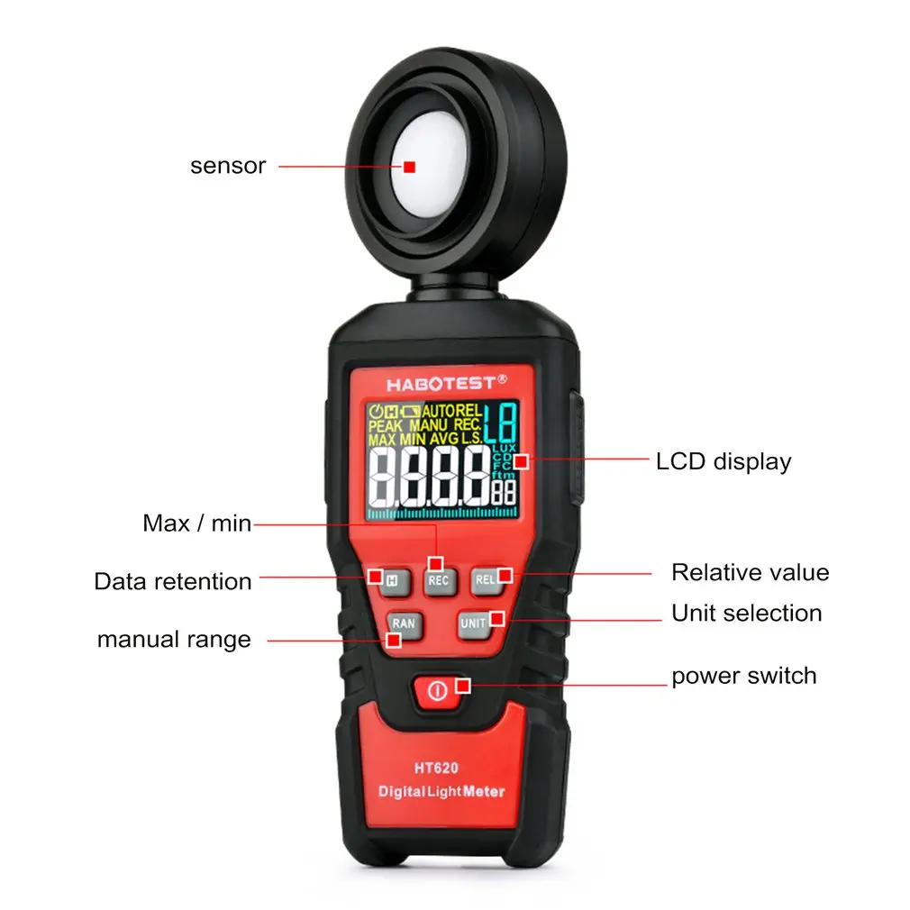 Features: 1. The 180-degree rotating probe can meet your different measurement needs. 2. High-definition color screen backlight display, support backlight display, strong light and easy reading measurement at night. 3. Two measurement units, support FC and LUX measurement to meet different needs. 4. Light meter can measure light accurately, fast and sensitively, and the sampling rate is about 0.5 seconds. 5. With high-precision photoreceptor, LUX large range, low power consumption, fast measurement. Description: Light meter supports automatic shutdown, with high-definition backlit display, supports data retention, and maximum/minimum display. Specifications: Brand: HABOTEST Model: HT620 Measuring range: 0~200000Lux (0~20000FC) LED category: standard light source incandescent lamp-L0 Display: LCD with analog bar, 200,000 counts Backlight: YES Auto/manual range: YES Data retention: YES MAX/MIN/AVG recording function: YES Relative value: YES Peak hold: YES Zero point calibration function: YES Automatic shutdown: YES Undervoltage indication: YES Powered by :3 * 1.5V AAA Battery (not included) Size: 190*60*33mm Package Included: 1 Set * Light Meter