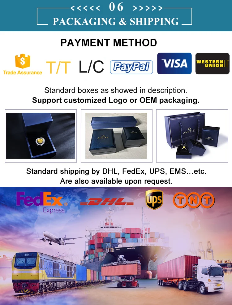 Все наши ювелирные изделия из драгоценных камней, обручальное кольцо с бриллиантом, поставляются с роскошной ювелирной упаковкой, брендом ANSTER или натуральной коробкой. Поддержка пользовательских ювелирных изделий и пользовательского дизайна упаковки.