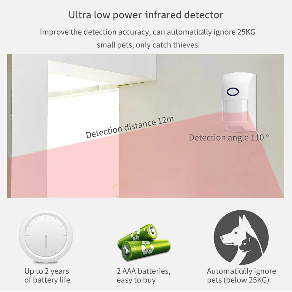 ● Автономная идентификация громкости домашних животных, может эффективно предотвращает попадание домашних животных ложных сигналов тревоги 25 кг.