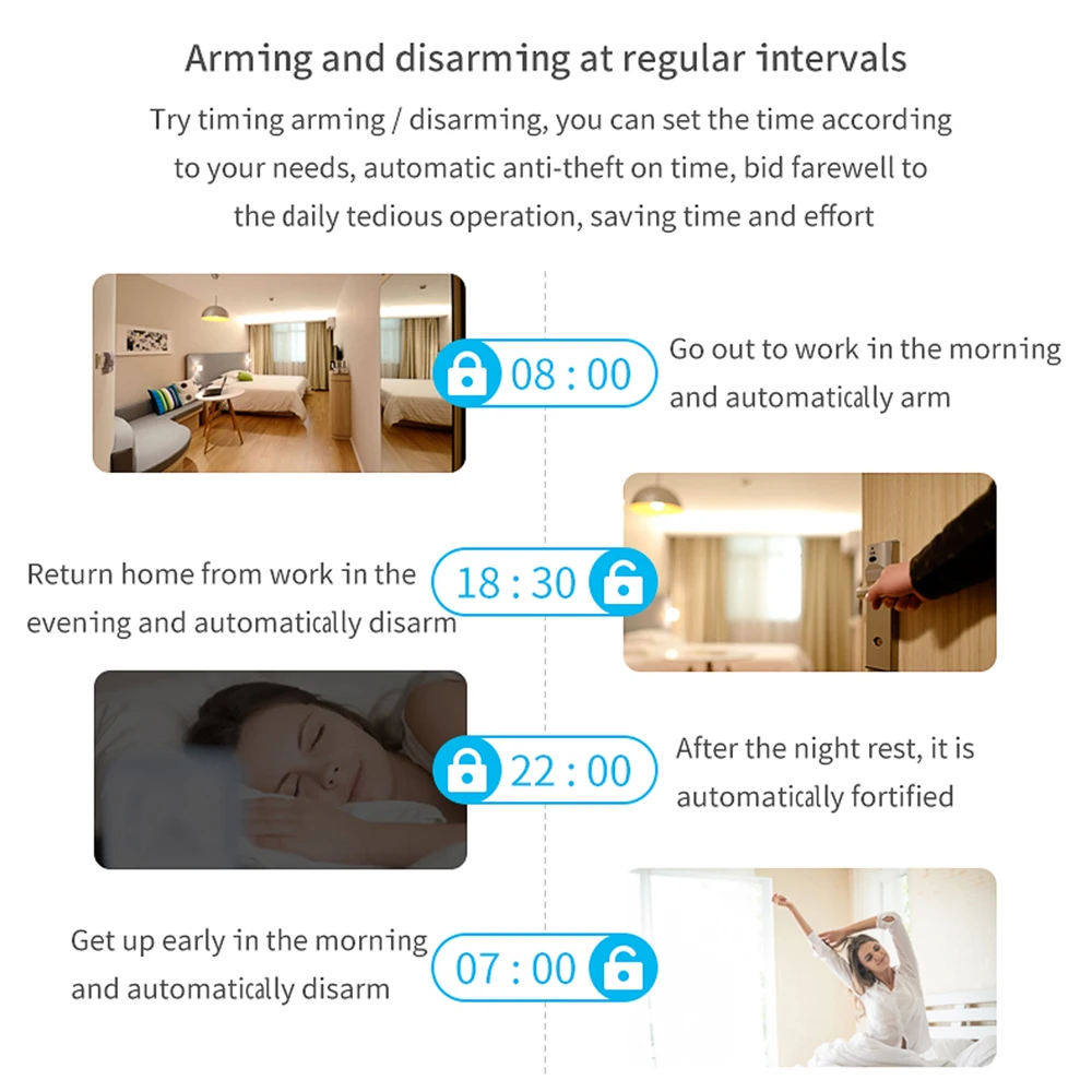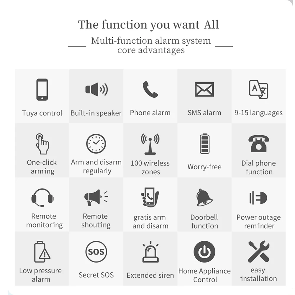 ● Поддержка основной двери, вестибюля, помощи, спальни, окна, балкона, периметра, дыма, газа, окиси углерода, утечки воды, дверной звонок, PIR детектор, дверной магнитный детектор, И другие зоны имя и номер могут быть установлены произвольно.