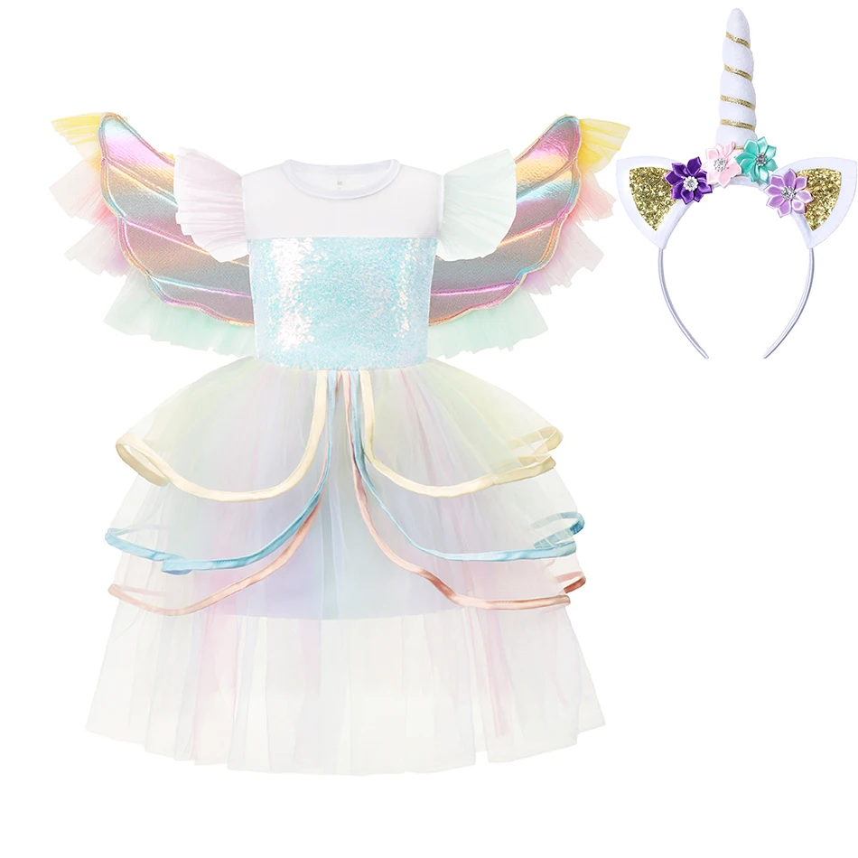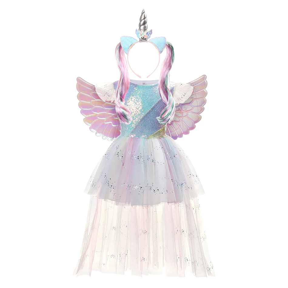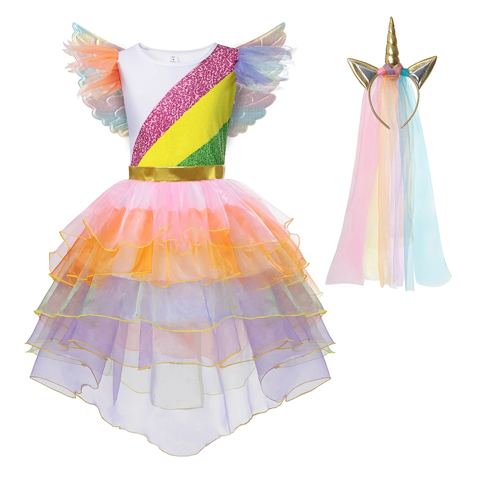 Girl Rainbow Unicon Dresses Tutu Princess Party Dresses Children Christmas Halloween Cosplay Costume With Headband Wings 4-10Y