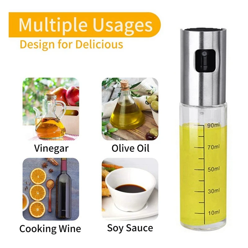 Многоцелевой-этот спрей для оливкового масла-это инструменты для дома и кухни. Многоразовый и многоцелевой. Заполните этот распылитель всеми видами приправ, такими как оливковое масло, уксус, соевый соус, сок лимона и лайма, херес или вино. И широко используется во время приготовления салатов, приготовления пищи, выпечки, обжига, гриля, жарки, барбекю и так далее.