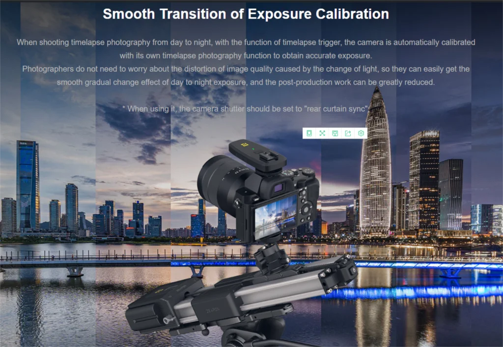 Триггер Timelapse приносит совершенно новый опыт для рельсовых слайдеров Съемки сцены timelapse, прорывается через ограничение, что «рельсовый слайдер может управлять камерой только в одном направлении» в этой сцене, И достигает «управляющего рельсового слайдера камеры» через передачу триггерных сигналов timelapse, так что камера становится основным устройством, И параметры можно отрегулировать более свободно для того чтобы соотвествовать больше сцен timelapse.
