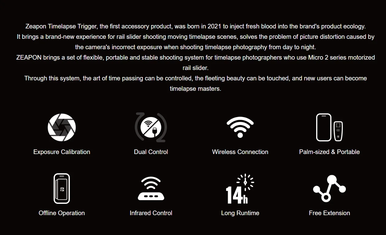 С микро 2 серии моторизованная рельсовая ползунок и триггер timelapse, а также новое обновление приложения ZEAPON приносит набор гибкой, портативной и стабильной системы съемки для любителей фотографии timelapse, И создает наиболее полный опыт съемки timelapse.