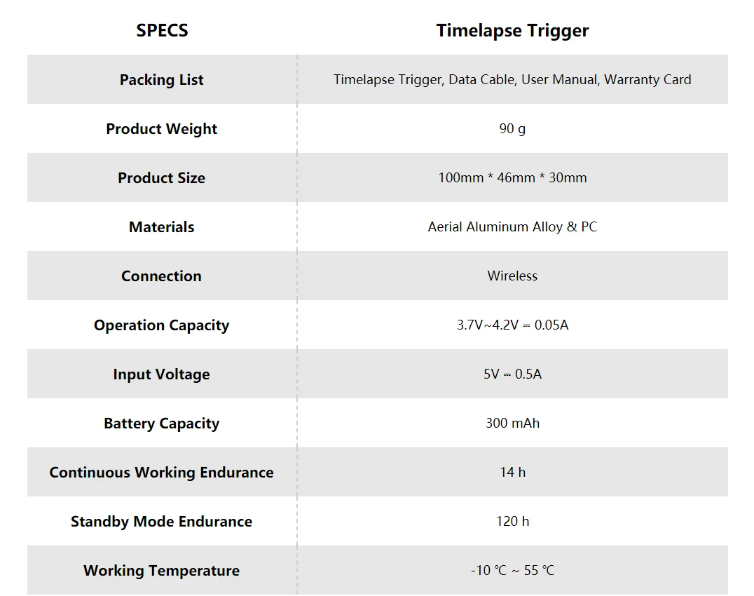 * Триггер timelapse может быть адаптирован только для использования с микро 2 серии моторизованная рельсовая ползунок;