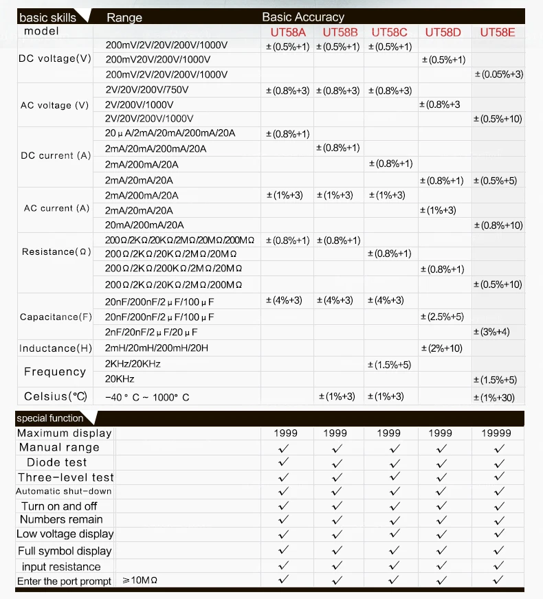 Серия UT58-это безопасный и надежный цифровой мультиметр с ручным диапазоном, который прост в эксплуатации. Большой ЖК-экран 60 мм x 54 мм удобно отображает результаты измерений. Эта серия цифрового мультиметра удовлетворяет различные приложения как в электронике, так и в электрических областях.