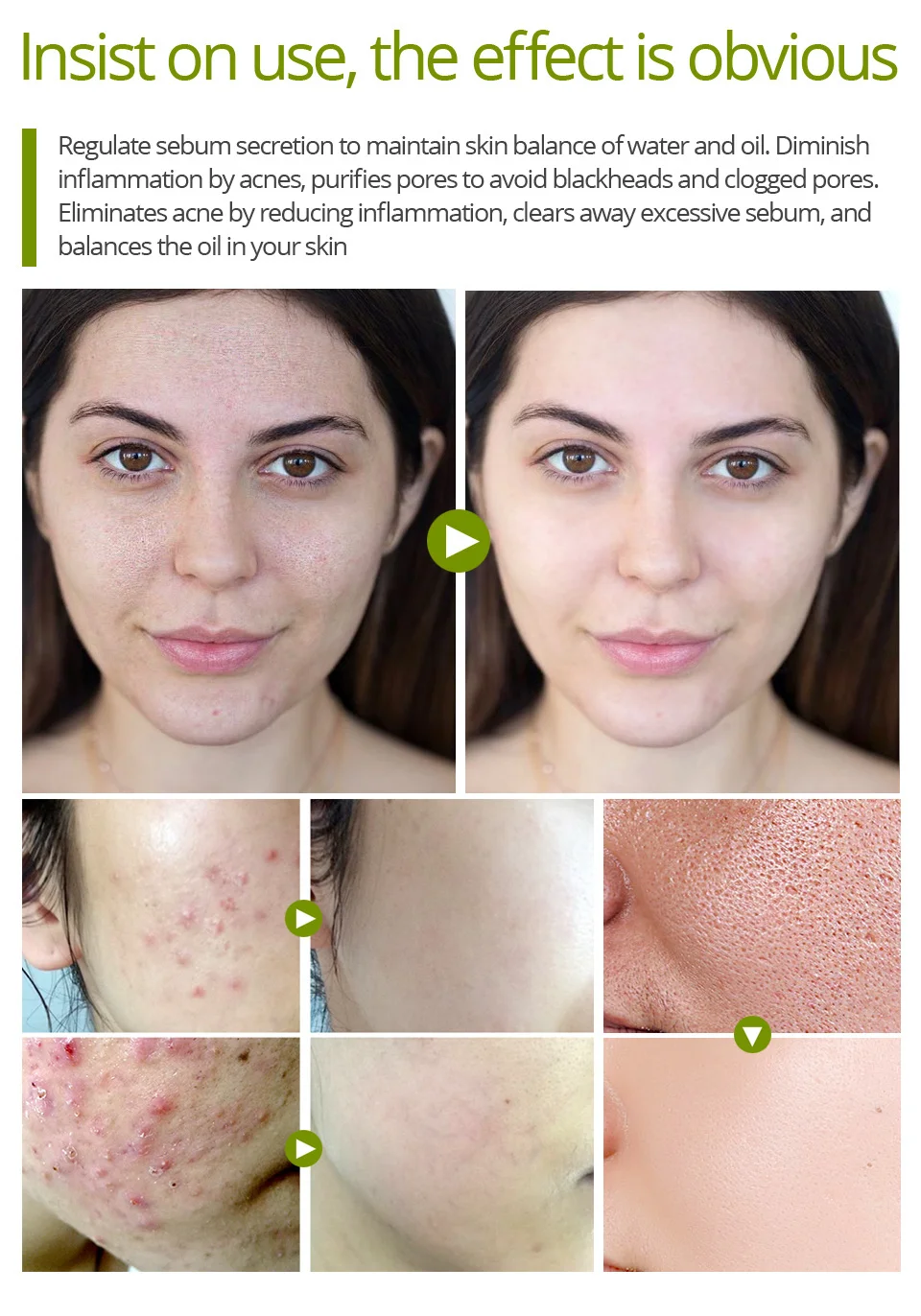 Регулируйте секрецию кожного сала для поддержания баланса кожи водой и маслом. Уменьшает раздражение акнами, очищает поры, чтобы избежать черных точек и засоренных пор. Устраняет угревую сыпь, уменьшая раздражение, очищает от избыточного кожного сала и балансирует масло в вашей коже