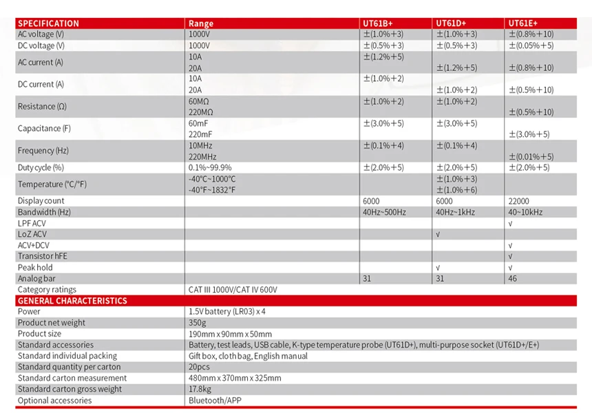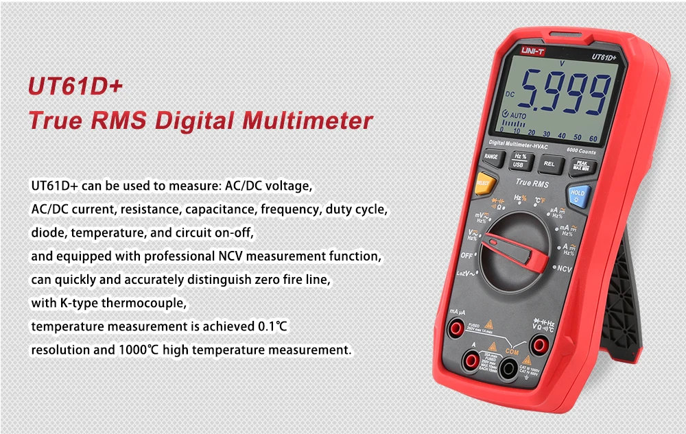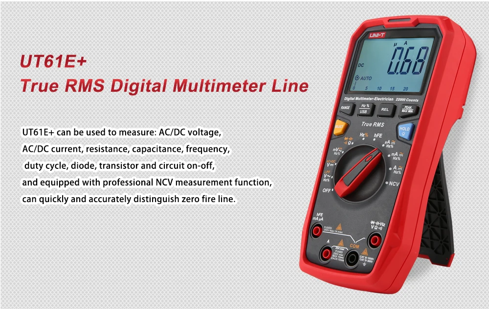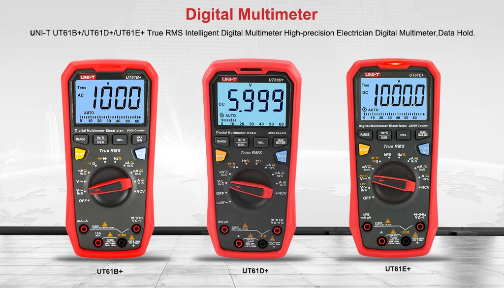Серия UT61 +-это надежные цифровые мультиметры RMS с отображением 6000 (UT61B +/D +) и 22000 (UT61E +). Он может измерять до 1000 В переменного/постоянного тока.