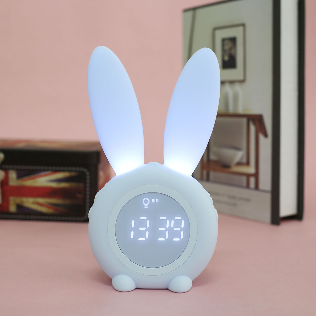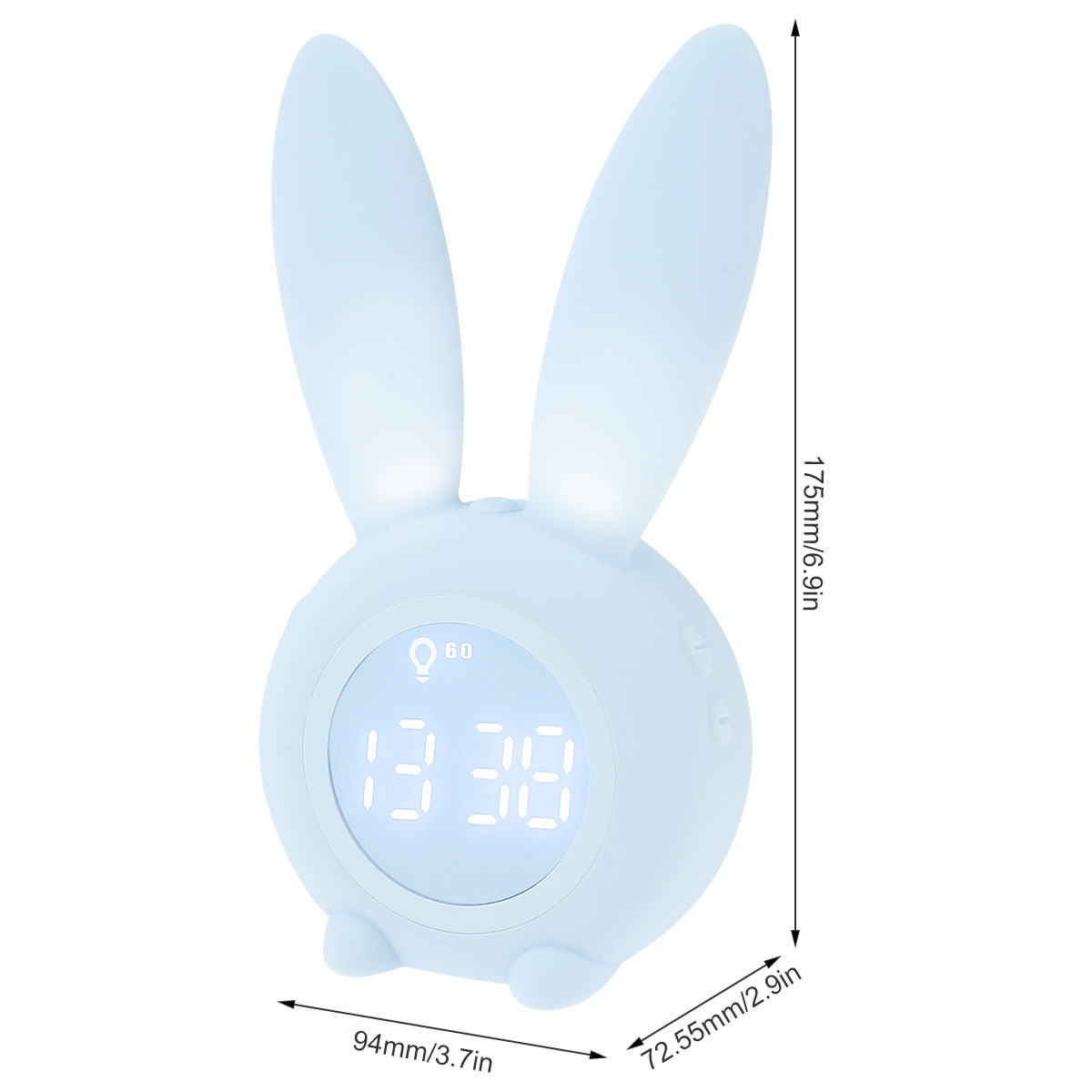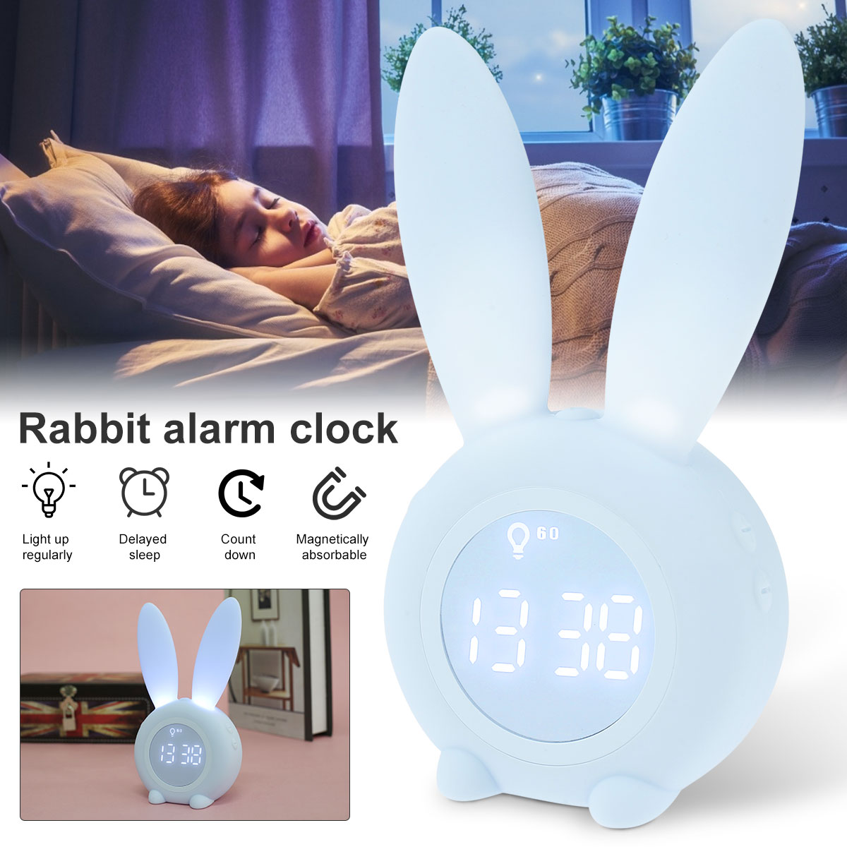 【Cute Rabbit Wake Up light】это милый будильник, который выглядит как милый кролик. Уши кролика могут излучать мягкий светильник, и он может сопровождать детей спокойно спать в темную ночь! Этот светильник будильника не только учит ваших детей, когда пришло время ложиться в кровать и когда нормально просыпаться, но и учит детей независимости. Идеальный подарок для ваших детей и семьи.