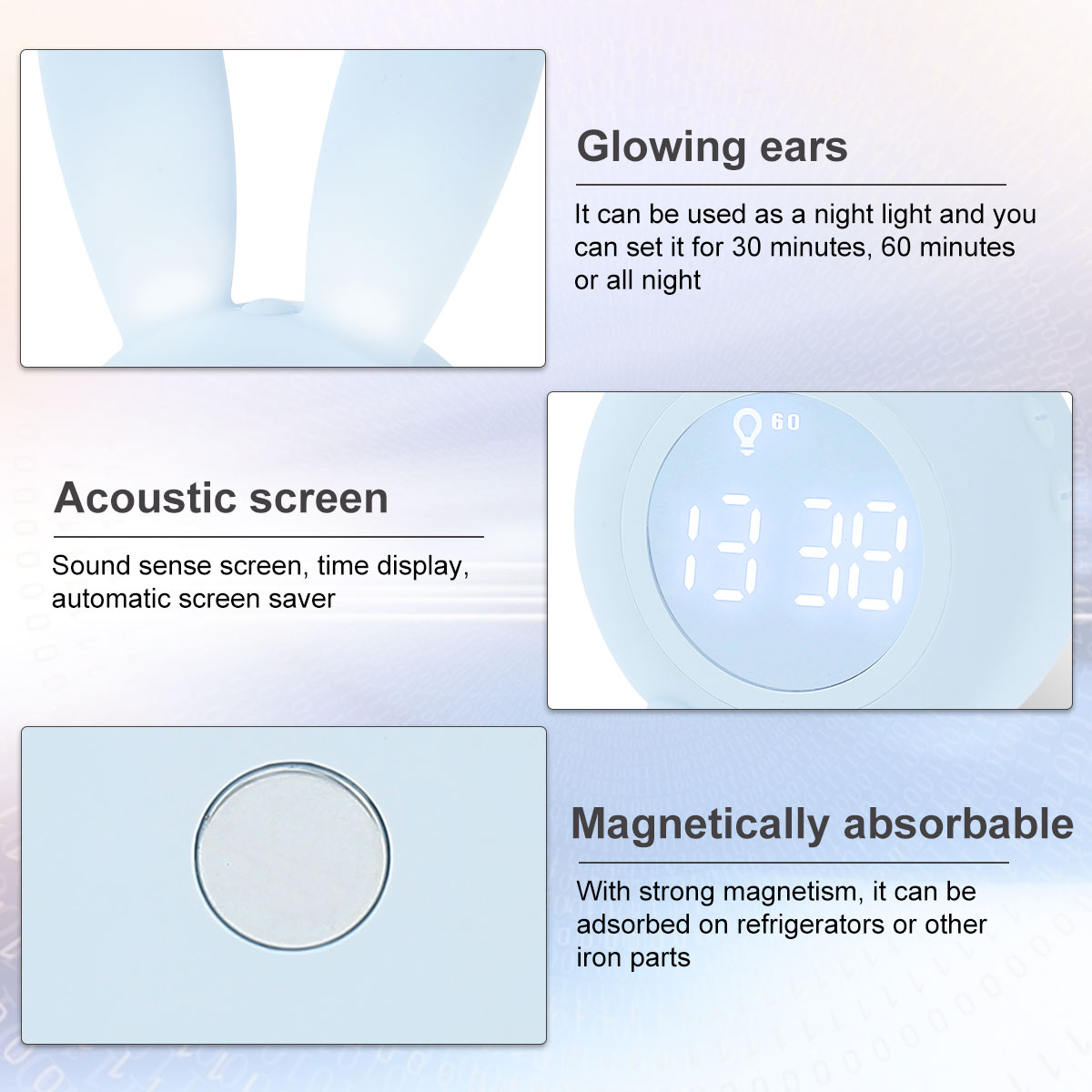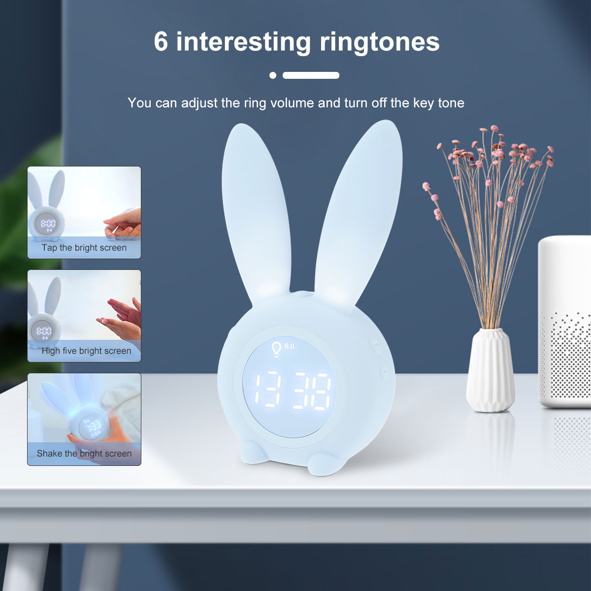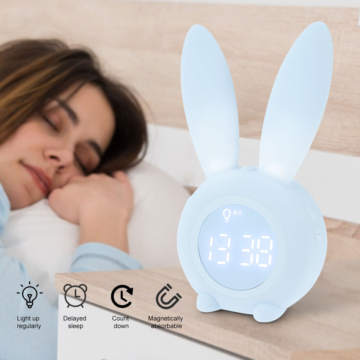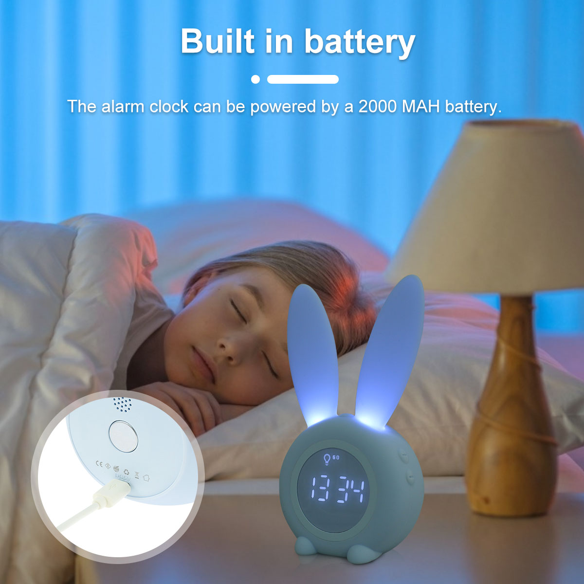 【Cute Rabbit Wake Up light】это милый будильник, который выглядит как милый кролик. Уши кролика могут излучать мягкий светильник, и он может сопровождать детей спокойно спать в темную ночь! Этот светильник будильника не только учит ваших детей, когда пришло время ложиться в кровать и когда нормально просыпаться, но и учит детей независимости. Идеальный подарок для ваших детей и семьи.