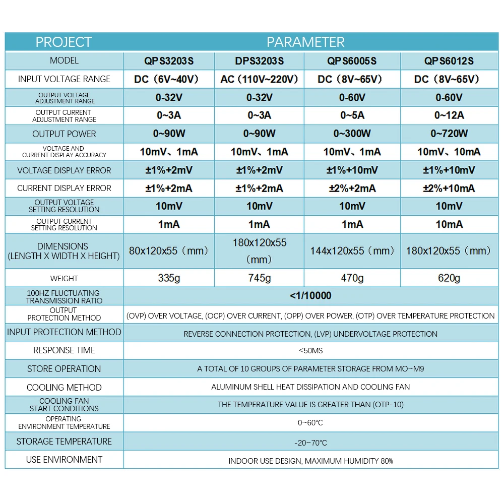 QPS серии программируемый цифровой контроль понижающий источника питания, маленький размер, высокая мощность, высокая эффективность, стабильная работа; Источника питания использует 32-битный микропроцессор управления, может точно установить и отобразить различные физические параметры, такие как напряжение и ток; И может быть передан через хост-компьютер, он общается с компьютером для регулировки выходного напряжения и тока и может контролировать выходное напряжение и ток в режиме реального времени. Он очень подходит в качестве источника питания для отладки, обслуживания и экспериментов.