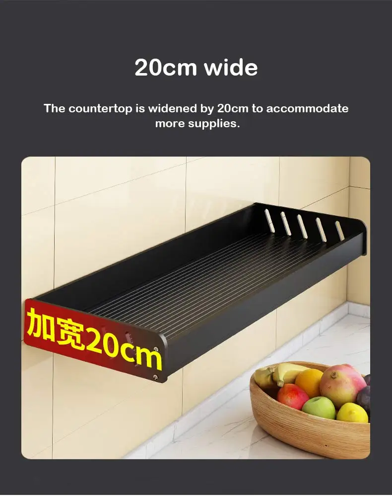 3. Расширьте ширину, можете положить больше приправ бутылок и других кухонных принадлежностей, увеличить ограждение, так что предметы не легко упасть, есть подвесные стержни и крючки под ними, чтобы повесить все виды кухонной утвари, так что кухня может смотреть более аккуратно.