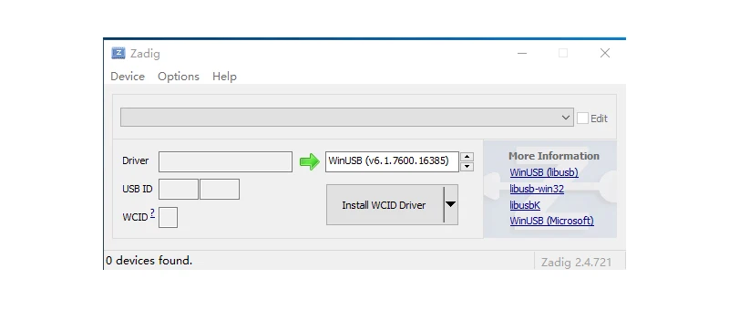 3. Нажмите «Опции» и включите «Список всех устройств». Выберите устройство с именем «fx2lafw», идентификатор USB которого 1D50:608C и выберите «WinUSB» в покрытии драйвера. Затем нажмите кнопку «установить драйвер».