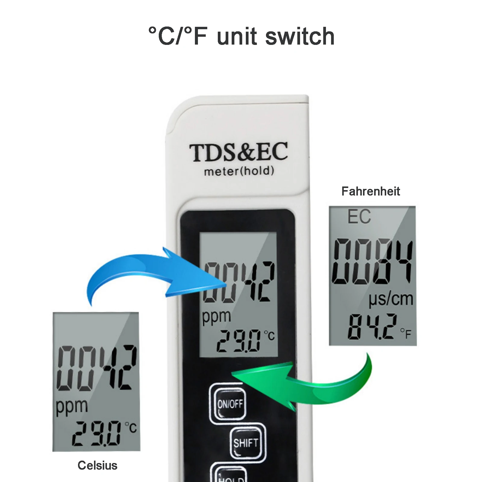 Большой ЖК-дисплей: двойной дисплей данных экрана и дисплей качества воды TDS/Проводимость EC и значение температуры в то же время с функцией хранения данных, легко справиться с различными средами.