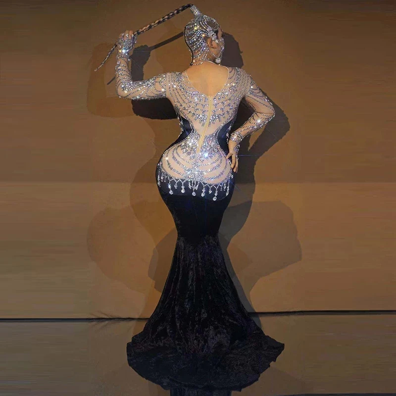 "Русалка" чёрная Стразы платье, женское, сексуальное, элегантное вечернее платье с украшением в виде кристаллов с длинным шлейфом платье сценический костюм