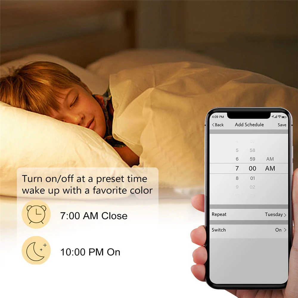 [Функция синхронизации] Просто установите расписание в вашем смартфоне, чтобы автоматически включить или выключить свет. Вы не забудете выключить свет, что сэкономит энергию. Каждый член семьи может управлять переключателем через приложение, которым вы делитесь. Используя функцию синхронизации, сцены/сцены могут быть свободно объединены и запрограммированы.