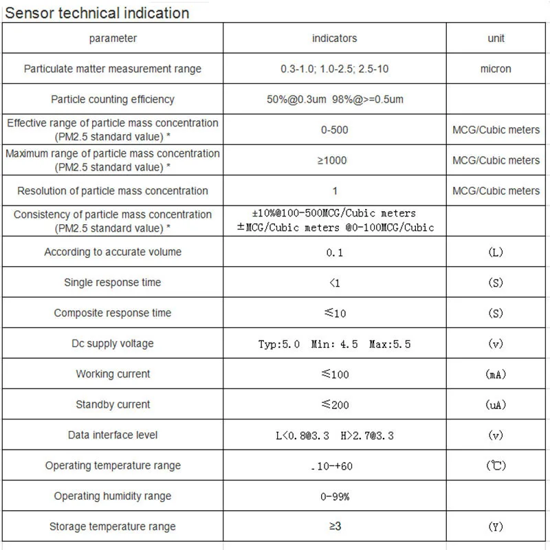 Примечание 1: Максимальный диапазон означает, что датчик гарантирует, что максимальное выходное значение PM2.5 стандартное значение не менее 100 микрограмм на кубический метр. Более 1000 микрограмм на кубический метр подлежат фактическому измерению.Примечание 2: Данные о консистенции концентрации твердых частиц являются данными в коммуникационном протоколом. Измеренные условия окружающей среды 20 ° и влажность 50%
