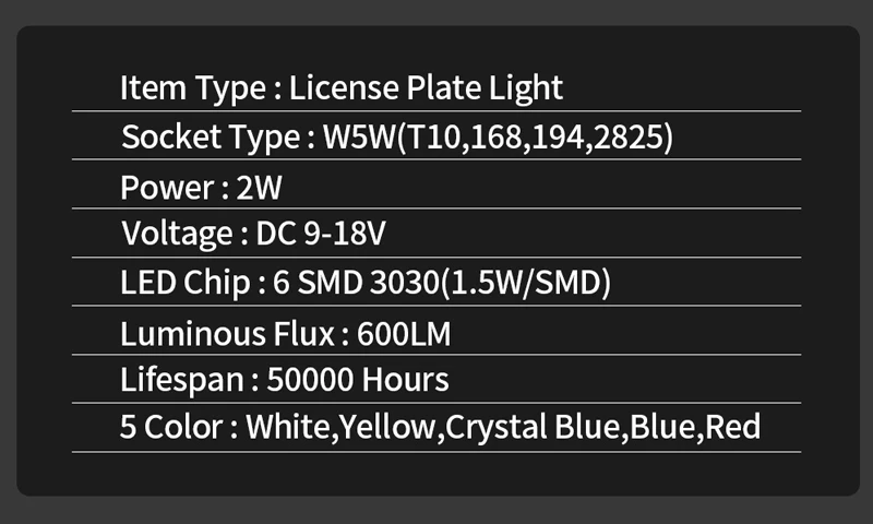 3. Тип разъема: W5W(T10, 168194, 2825)
