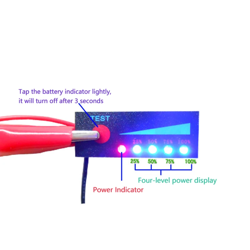 Ультратонкий дисплей питания, 5 светодиодный индикаторов, дисплей более интуитивно понятный и красивый. Он может использоваться в широком спектре применений, таких как литиевые батареи, свинцово-кислотные батареи, литий-железо-фосфат и электрические транспортные средства. Параметры отображения уровня литий-ионного аккумулятора: (допускается погрешность 2%) 1. Напряжение батареи> N * 3,2 В, 1 светодиодный индикатор (Примечание: N = номер батареи) 2. Батарея напряжение> N * 3,4 V, 2 светодиодный загорается 3. Напряжение батареи> N * 3,6 V, 3 светодиодный свет вверх 4. Напряжение батареи> N * 3,8 V, 4 Светодиодный индикатор уровня свинцово-кислотной батареи 12 В Диапазон отображения:(4S литий-фосфатная батарея может быть приемлема) 1. Напряжение батареи превышает 11 В, 1 светодиодный индикатор загорается 2. Батарея напряжение превышает 11,6 V, 2 светодиодный загорается 3. Батарея напряжение превышает 12,3 V, 3 светодиодный загорается 4. Напряжение батареи превышает 13 в, 4 светодиодный загорается 3,7 V литиевая батарея, полная зарядка 4,2 V 2S литий 7,4 V батарея, полная зарядка 8,4 V 3S литий-ионная перезаряжаемая батарея 12V, аккумуляторная батарея полной зарядки 12,6 V 4S литиевая батарея, полная зарядка 16,8 в 12 В свинцово-кислотная аккумуляторная батарея, 12 в инструкции по автомобильному аккумулятору: 1. Подключите положительные и отрицательные клеммы дисплея к положительным и отрицательным клеммам тестируемого аккумулятора. Нажмите красную кнопку пальцем, и светодиодный светильник загорится. Отображение мощности аккумулятора в режиме реального времени. 2. Отпустите палец, светодиодный светильник будет выключен через 3-5 секунд, и он не будет потреблять энергию, когда он будет статичным. 3. С функцией обратного подключения, даже если положительный и отрицательный обратный сигнал не будет гореть, отрегулируйте его.