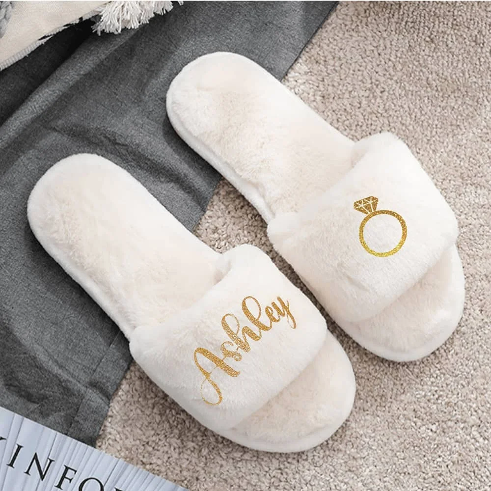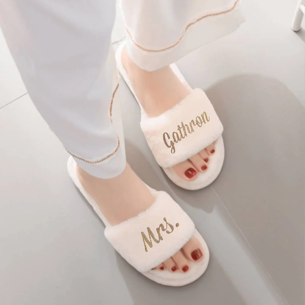 Пушистые тапочки для невесты и невесты белого цвета. Индивидуальный дизайн делает ваши тапочки уникальными.