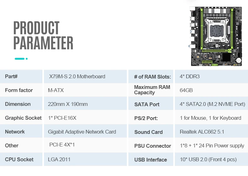 4 * слота памяти DDR3, чипсет X79 более стабильная производительность на борту M2 высокоскоростной сетевой карты с жестким диском intertace Gigabit, семифазный источник питания.