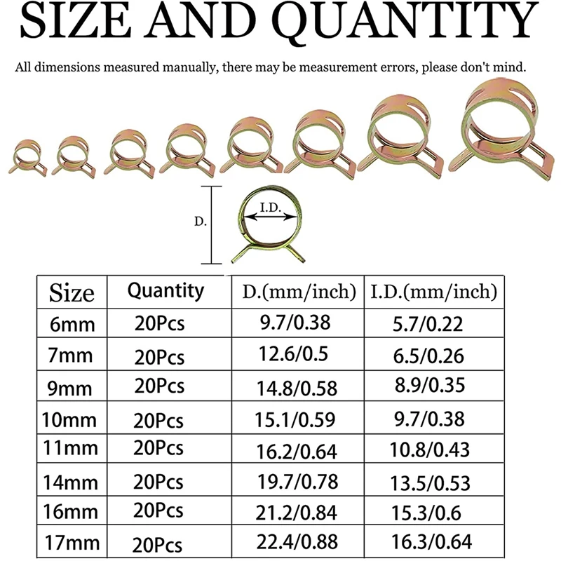 [Размер]: пружинный хомут включает 10 различных диаметров хомутов для адаптации к различным шлангам: 6 мм, 7 мм, 9 мм, 10 мм, 11 мм, 14 мм, 16 мм, 17 мм, большое разнообразие, подходит для многих размеров s