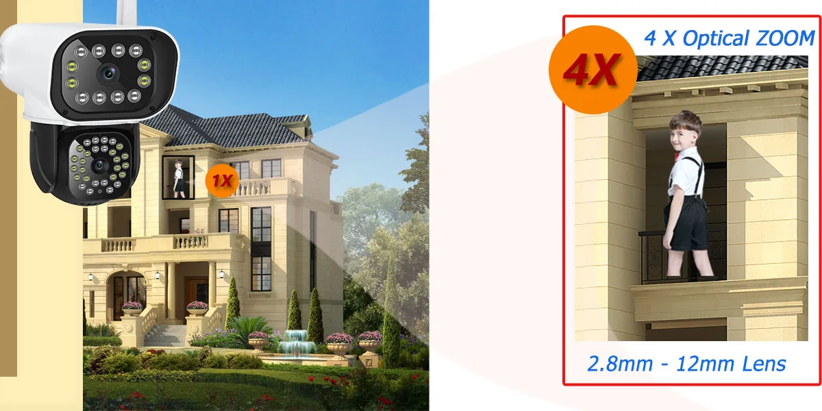 Камера, встроенная в 2,8 мм и 12 мм объектив с двумя объективами, легко переключается на 1.0X до 4.0X зум мгновенно в приложении.