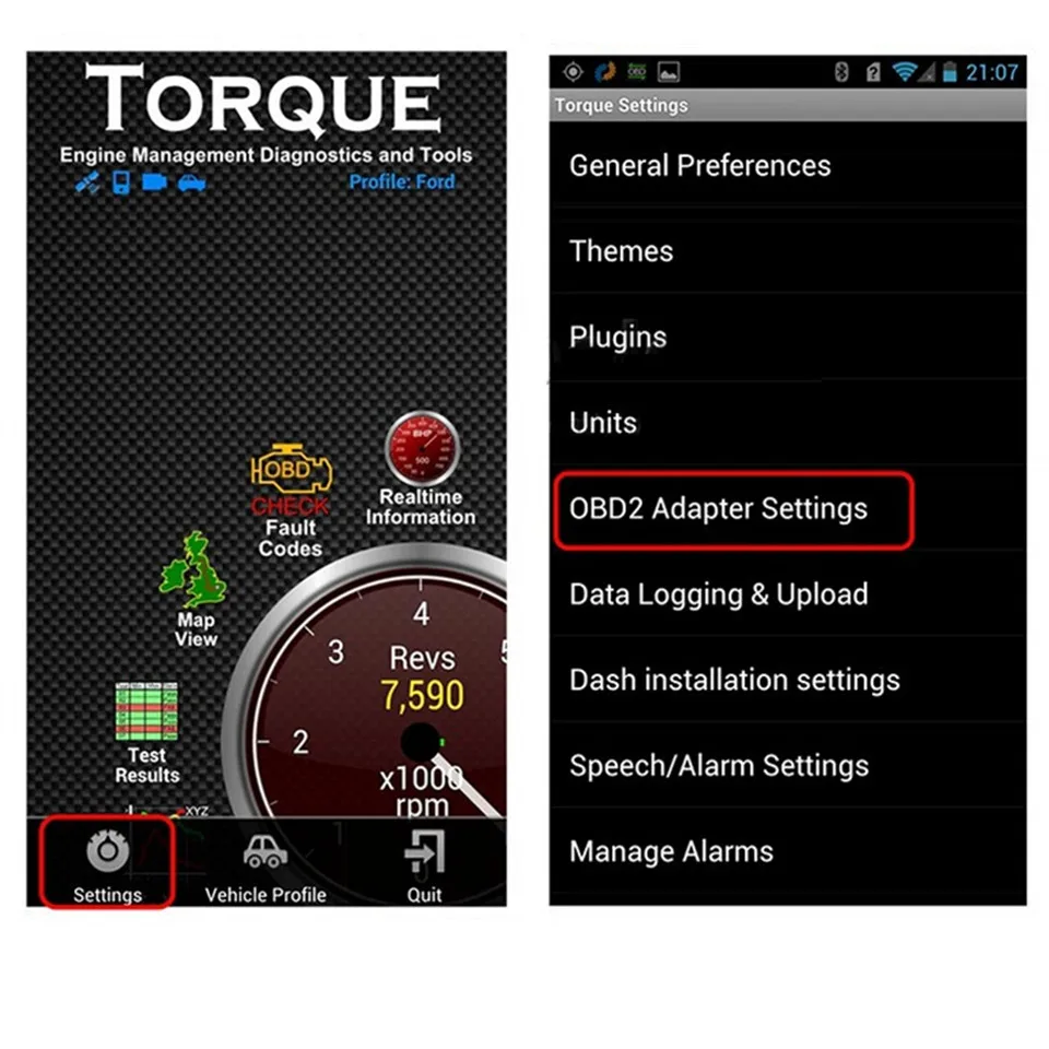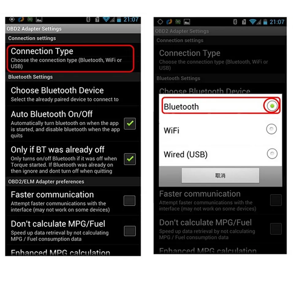 2. Откройте Torque-etting --- адаптер OBD2 Settins --- Тип подключения --- bluetooth-совместимость --- назад --- выберите bluetooth-совместимое устройство --- OBDII[AA:BB:CC:11:22:33].