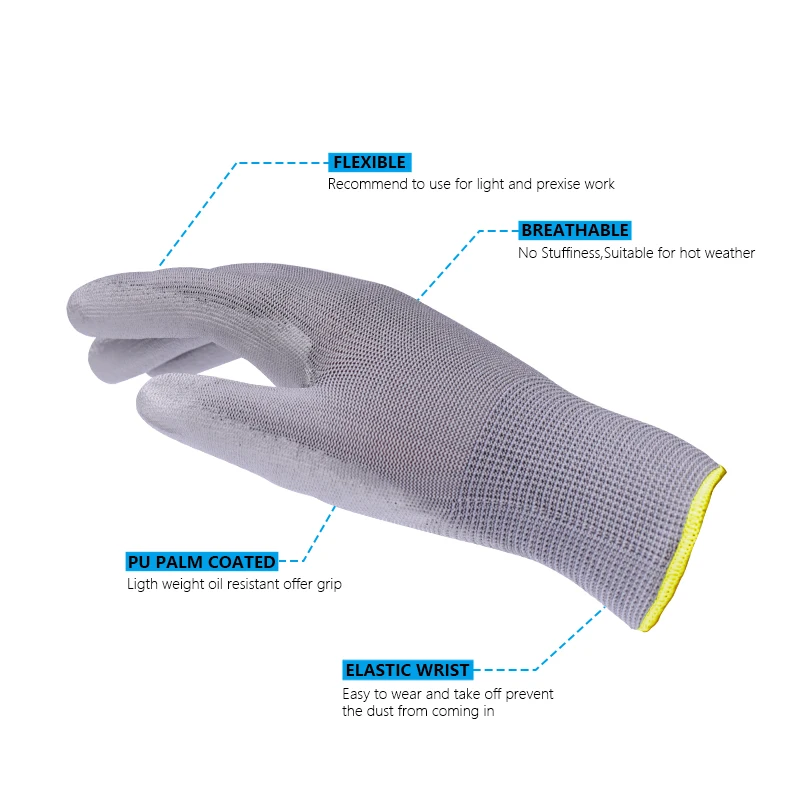 4.Преимущества:Сделано с белым 13 калибровочным комфортным и ловким полиэстеровым вкладышем/эластичным вязаным запястьем, погруженным в серое полиуретановое покрытие./Эта комбинация обеспечивает хорошую гибкость и ловкость пальцев по сравнению с хлопковыми перчатками./Эффективный выбор недорогой светильник для перчаток с качественными характеристиками.