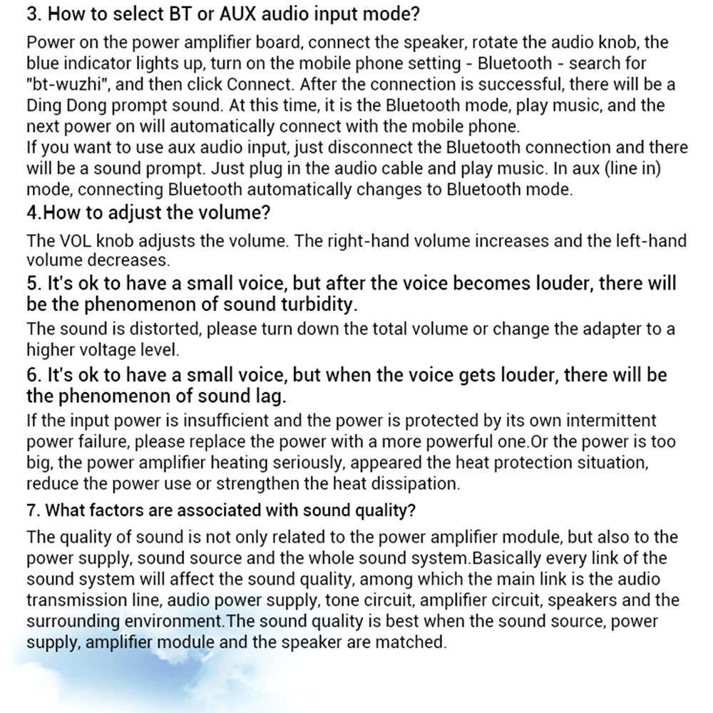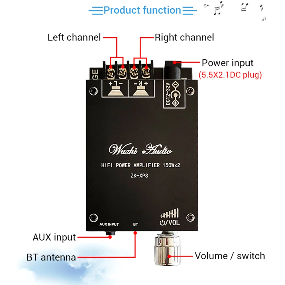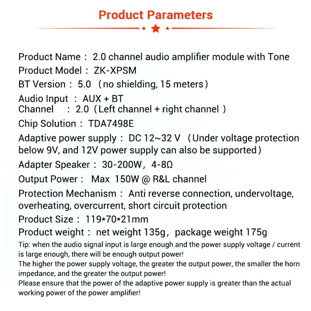 Чем выше напряжение источника питания, тем выше выходная мощность и чем меньше сопротивление динамика, тем больше выходная мощность! Убедитесь, что мощность адаптера больше фактической рабочей мощности усилителя!