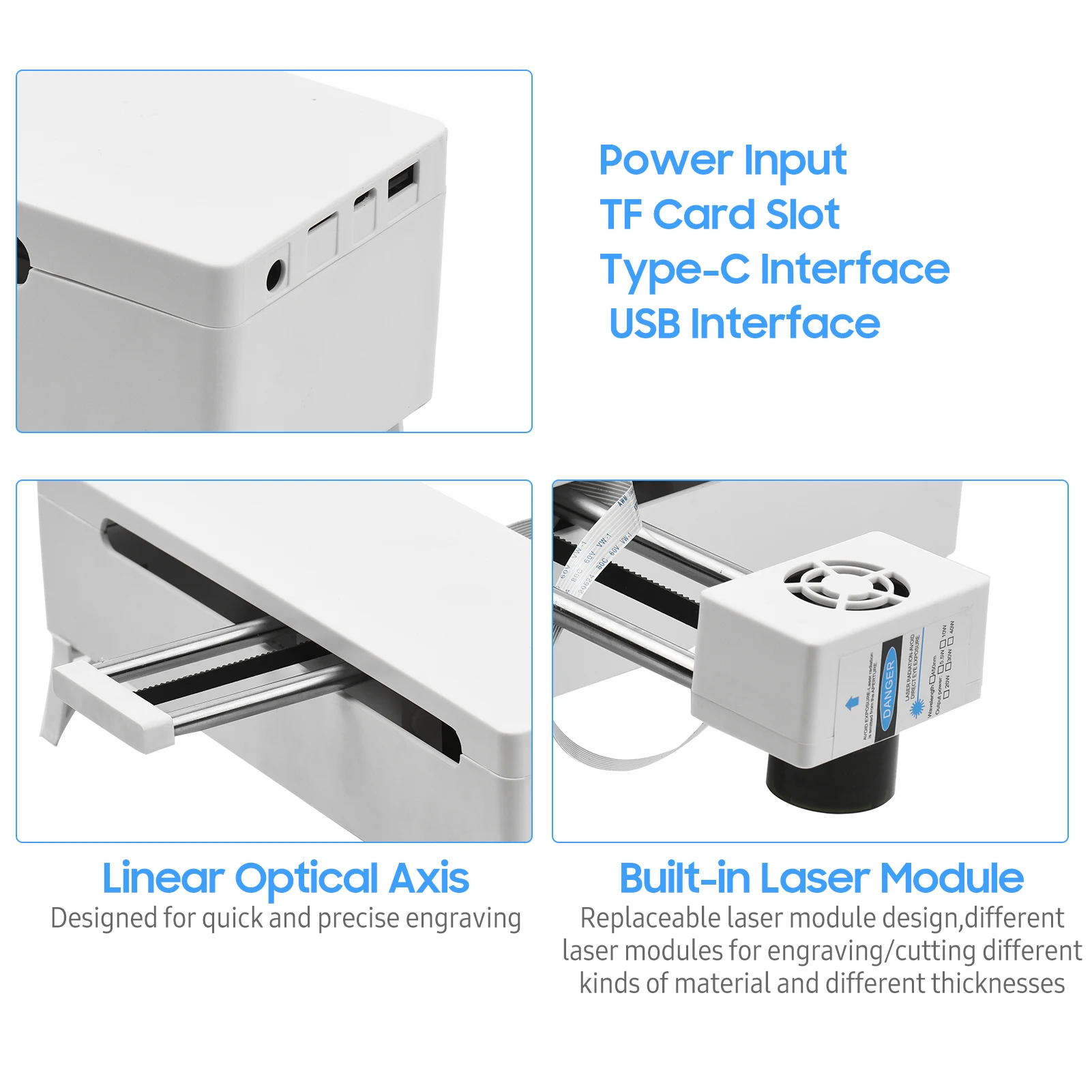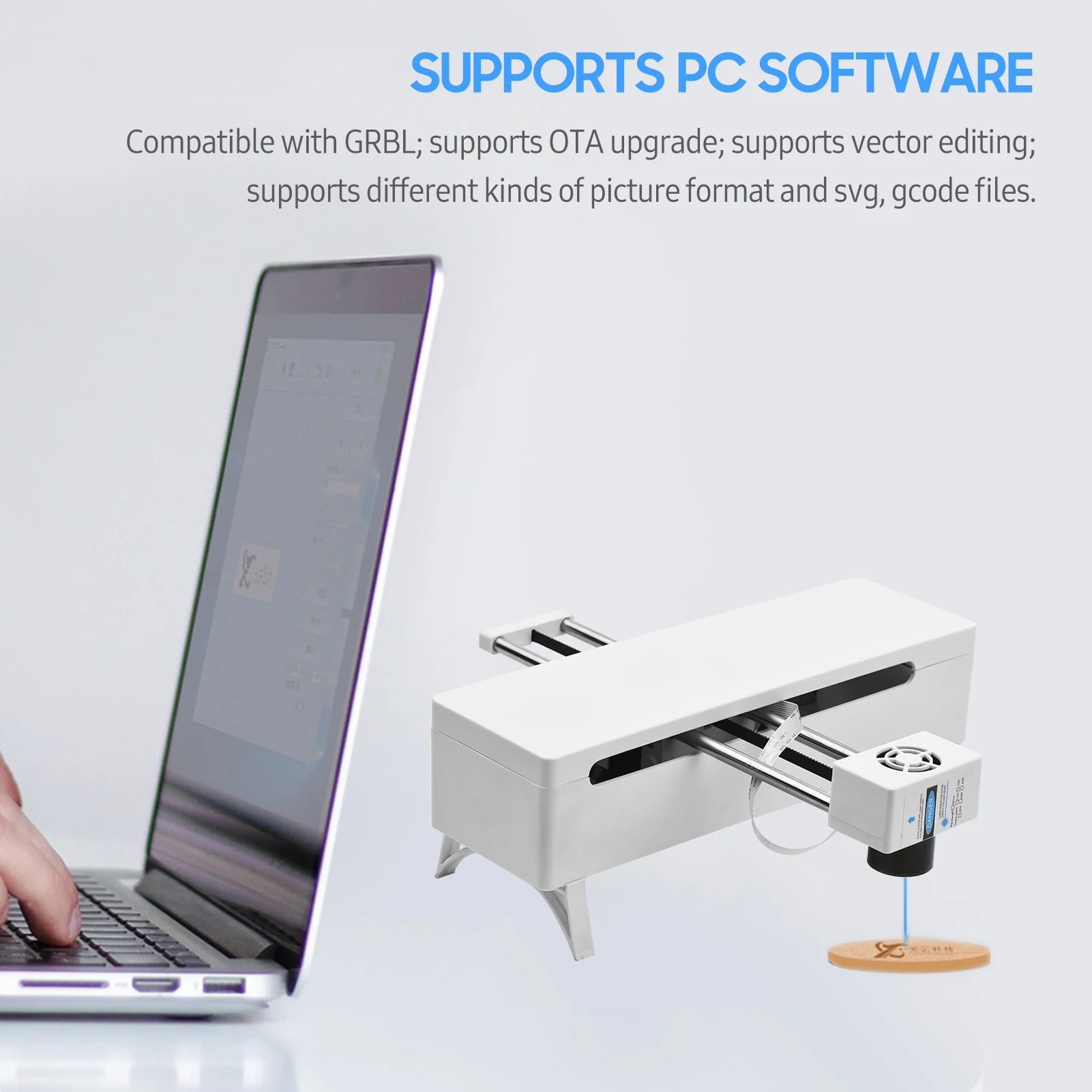 With type-C interface, the engraver supports PC software, compatible with GRBL; supports OTA upgrade; supports TF card; supports vector editing; supports different kinds of picture format and svg, gcode files.