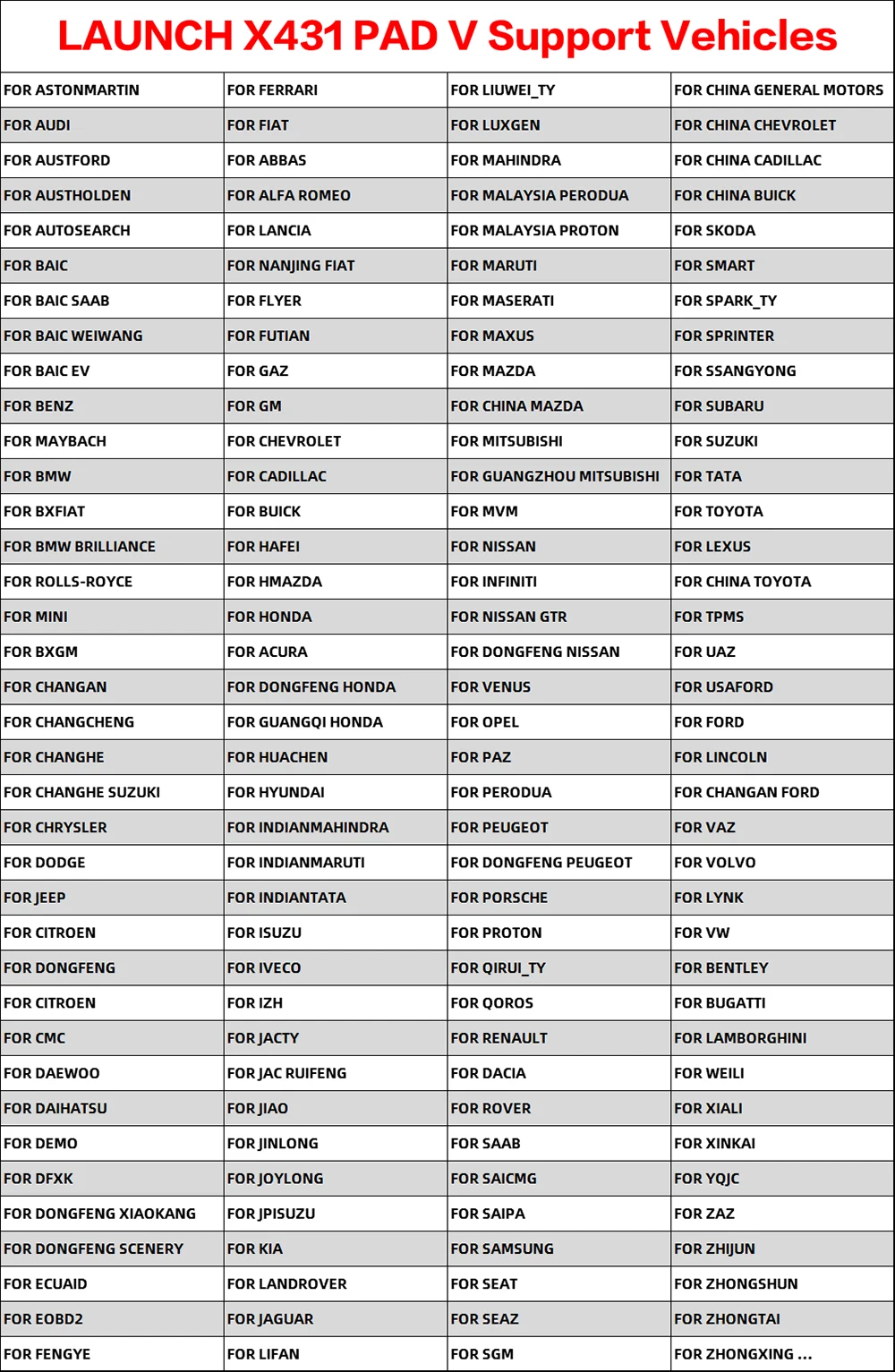 Другое устройство launch x431 поддерживает гибридные автомобили, но не поддерживает PEV. Сверхмощное программное обеспечение будет выбрано в 2021,6 году (Купите его в торговом центре). Диагностировать транспортных средств с бензиновым двигателем и 24V дизельный грузовых автомобилей/Автобусов/прицепы/экскаватора/с дизельным двигателем/Строительная техника/пикап/и т. д.