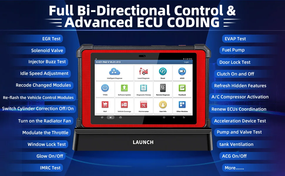 Инструмент сканирования LAUNCH X431 PAD V может выполнять двунаправленный контроль на всех системах, таких как ABS, топливные насосы, окна, двери и т. Д. И он поддерживает 50 + сервис сброса, как ключ IMMO,abs кровотечение, коробка передач, сброс масла, Кодирование инжектора, сброс передач, сброс SAS, сброс TPMS, Сброс DPF, сброс BMS, сброс ETS, сброс AFS, адаптация EGR.