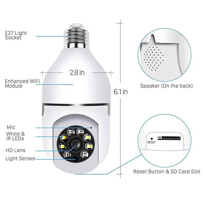 1. Функция: держатель лампы-это универсальный E27 держатель лампы, просты в установке, двухдиапазонный, Wi-светильник поддержка светильник ing, мобильный телефон Удаленный просмотр Wi-Fi соединение, интеллигентая (ый) человека обнаружения движения, и возможно нанесение трафаретной аномальный сигнал тревоги, камера, когда кто-то ломается, обнаруживается, что может активно звучать сигнал тревоги и мигать, Интеллектуальный двусторонний голосовой Интерком в режиме реального времени, 3 мегапиксельные пикселя высокой четкости, максимальная поддержка карты памяти 128G, поддержка облачного хранилища и хранения tf-карт.