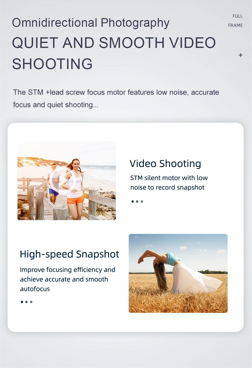 Объектив оснащен шаговым двигателем STM с блоком шестереночного типа, который обеспечивает бесшумную автоматическую фокусировку и не влияет на фото или видеосъемку...