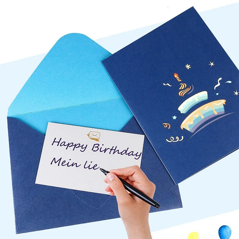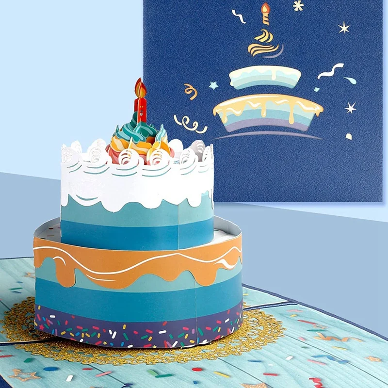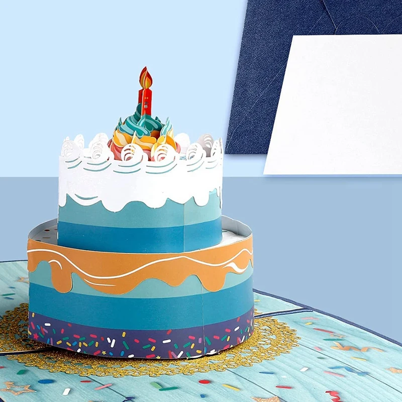 3D-карта на день рождения с синим двухслойным дизайном торта, день рождения карты с конвертом для семьи, друзей, детей, женщин