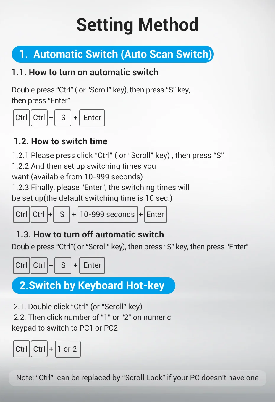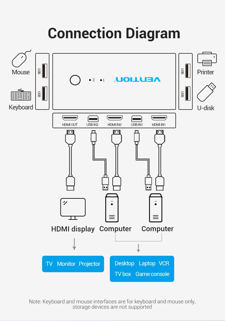 【 Переключатель горячих клавиш и беспроводное устройство 】поддержка беспроводной клавиатуры и мыши, переключатель горячих клавиш: Поддержка кнопки хоста и переключатель горячих клавиш, быстрое переключение между 2 источников на клавиатуре (две горячие клавиши: “Ctrl + 1/2”, “scrout Lock + 1/2”). Питание от USB: внешний адаптер питания не требуется.