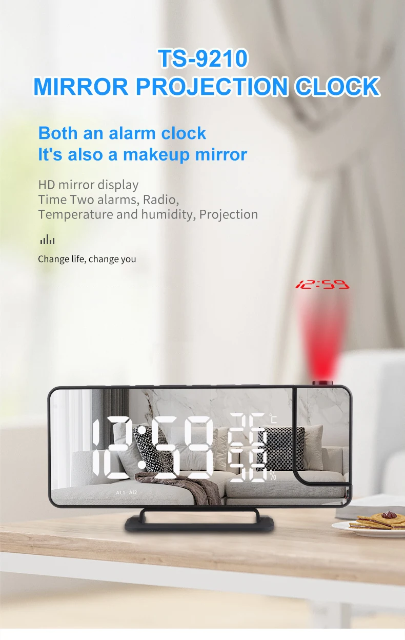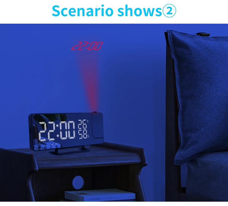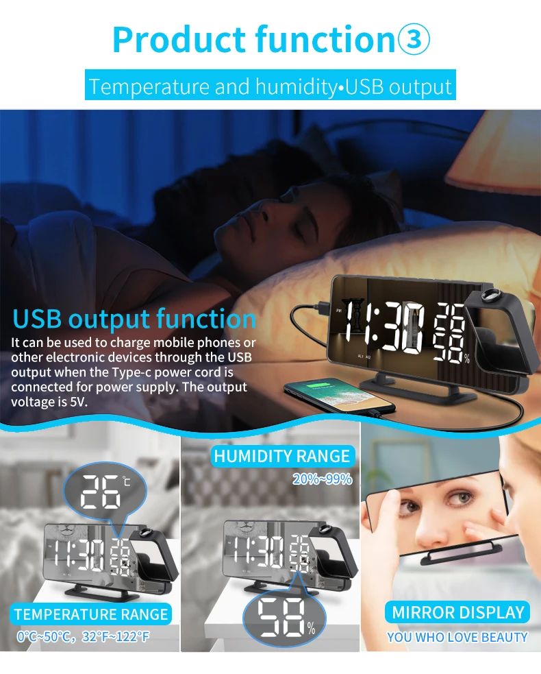 LED Digital Mirror Projection Alarm Clock Home FM Radio Thermometer Hygrometer USB Wake Up Watch 180° Projector Time Snooze Gift