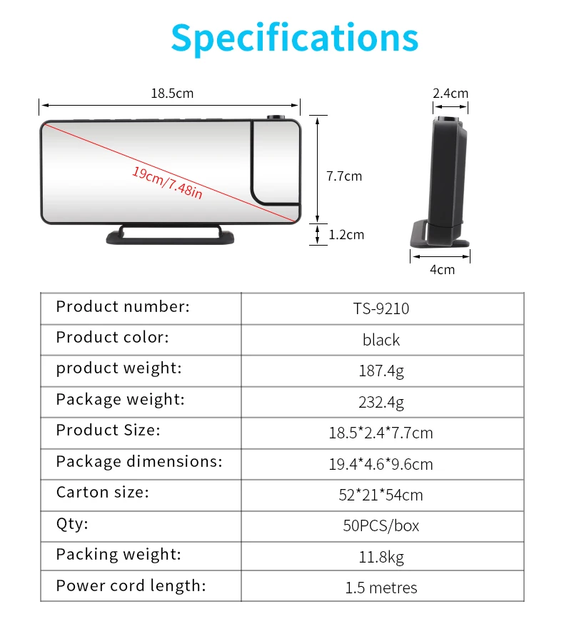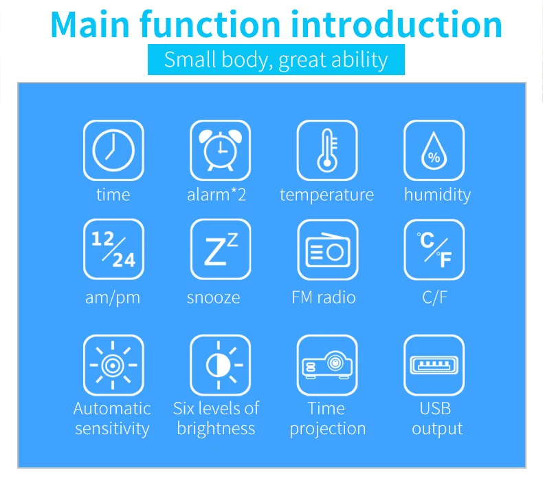 Projection function: project time, adjustable focus, 3-level projection brightness, can rotate the projection 180°.